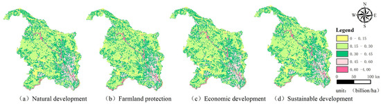 Additionally, under the economic development scenario, the total ESV of the study area is CNY 1065.03 billion, which is relatively higher than that under the farmland protection scenario. The transformation of ecosystems in the economic development scenario, particularly during the process of urbanization, may lead to a decrease in ESV. However, in future developments, measures such as improving land use efficiency and increasing urban green spaces may partially compensate for the loss of ecosystem service values. New ecosystem services, such as the recreational and cultural services of urban green spaces, as well as ecological compensation and restoration measures, help mitigate the negative impact of land use changes on ESV. Although the total ESV under the economic development scenario is higher than that under the farmland protection scenario, this does not guarantee long-term ecological sustainability, especially in ecologically fragile karst mountainous basins. The risk of long-term ecological damage must be prevented through sustainable land management and planning. Therefore, the economic development scenario should consider the long-term health of ecosystems and the sustainability of regional development to ensure this balance is maintained over the long term and effectively alleviate pressure on ecosystems. This is a key focus for future research and monitoring. For special regions like karst mountainous basins, development strategies must fully consider ecological vulnerability to avoid causing irreversible ecological damage.