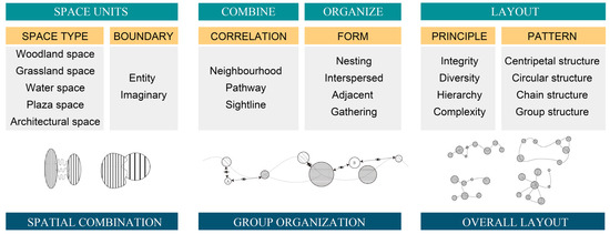 Landscape design is rooted in the concept of space, aiming to achieve a cohesive organization of spatial sequences. The landscape spatial graphic language is developed through the structuring and deconstruction of landscape space to modularize the overall landscape [63]. The systemic and composite characteristics of a landscape determine that local adjustments in the design process will affect the whole, and taking into account the characteristic relationships of multiple levels is necessary for planning and design and comprehensive adjustment. The modeling framework from unit to whole helps designers to sort out and recognize the complex spatial organization of a landscape, and the multidimensional spatial structure characteristic system can assist with systematic cognition and control the design from part to whole, which makes up for the insufficiency of landscape 3D spatial analysis perspectives limited to a certain scale or feature. As illustrated in Figure 1, the landscape space is conceptualized as a series of nested units surrounded by vegetation and other elements.