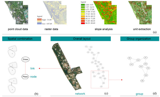 The construction of spatial structures involves two key components: network nodes (spatial units) and network links (spatial associations), as shown in Figure 3b. In the spatial structure model, connections between spatial units can take various forms, including overlapping interfaces and short paths that serve as transitional links [44]. Structural models are constructed using Cytoscape software, a powerful tool for building and analyzing spatial networks through automated drawing. The study constructs spatial structure networks based on the relationships between spatial units in the park, forming overall networks (Figure 3c). The group organizations of representative zoning districts are selected for the study based on design features (Figure 3d).