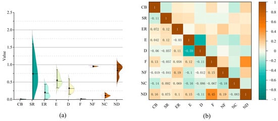 Distribution analysis and correlation analysis of data on spatial structure indicators. (a) Violin plot of spatial structure indicators. (b) Correlation analysis of data on spatial structure indicators.