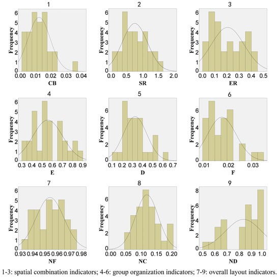 The detailed results of quantitative spatial data are shown in Appendix A.2. The distribution of the nine indicators was analyzed and visualized with the help of SPSS 22 and Origin 2024, as shown in Figure 4a and Table 2. The analysis reveals that the values of each indicator fall within specific intervals, but there are notable variations in the range and span of these intervals.