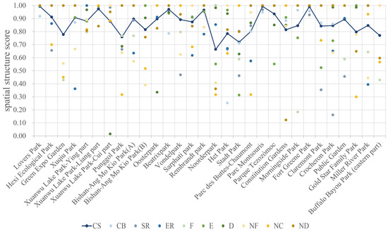 Analysis of evaluation scores of spatial structure indicators for 30 parks.