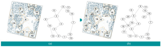 As illustrated in Figure 3a, the study constructs the raster model of a park based on 3D point cloud data using ArcGIS and conducts slope analysis. Slope changes in the raster (representing the edges of plant communities and buildings) were extracted as boundaries. Discontinuous spatial interfaces are completed manually by filling in boundary gaps smaller than 5 m, gaps significantly smaller than the scale of spatial units, or boundaries between areas with different functions [54]. The spatial unit in this study focuses on the space available for visitors’ activities. According to the theory of minimum external modulus [71], units with an area less than 400 m2 (20 × 20 m) are either excluded or merged with adjacent units.