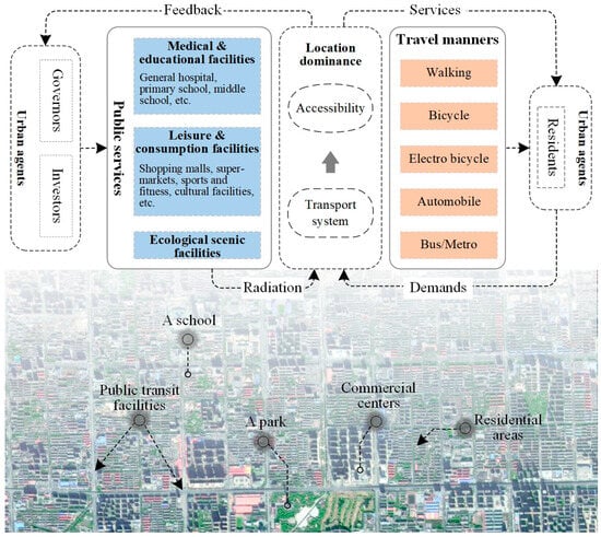 Location dominance, as both a cause and consequence of the interaction between urban agents (i.e., residents, governors, and investors), is developed in this paper as an indicator to evaluate the spatial heterogeneity and equality of public services. There is spatial friction or time costs when residents meet their demands for public services via different transportation options. Correspondingly, the spatial friction from the transportation system also affects the radiation extent of public services. Based on feedback related to location dominance, governors will consider spatial equality in terms of obtaining services, and investors will consider the investment profit from constructing services in different positions. Thus, the spatial heterogeneity of location can help (1) residents choose reasonable transportation, or choose an appropriate residential area; (2) investors calculate the return rate related to the choice of investing location; and (3) governors obtain the basis on which to improve the quality of urban space. The workflow of location dominance is shown in Figure 1.