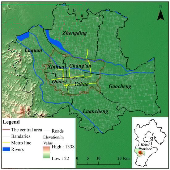 Shijiazhuang is the capital of Hebei Province, one of the important cities in the Beijing–Tianjin–Hebei Urban Agglomeration. It is located west of the North China Plain and east of Taihang Mountain. In order to alleviate urban problems caused by overconcentration in the central urban area, a multi-center structure within the metropolitan area (i.e., “one river, both sides, three groups”) was proposed in the Shijiazhuang City Master Plan (2011–2020). Specifically, the structure sits across both sides of the Hutuo River, with the central area and industrial area on the south side and the Zhengding Ancient City and Zhengding New District on the north side. Three groups refer to Gaocheng, Luancheng, and Luquan around the central urban area. Thus, the study area includes the central urban area and four suburban areas, covering 107 street/town districts, between 37°46′ and 38°23′ N, and 114°12′ and 114°58′ E, as shown in Figure 2. By the end of 2022, there were 6.24 million permanent residents in the study area, with an urbanization rate of 87.7% and GDP of CNY 468.14 billion, accounting for 70.5% of the total GDP of Shijiazhuang.