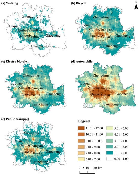 The inevitability of a disparity in public service distribution is recognized [,,]. The results show that the accessibility of public services in Shijiazhuang exhibits a strong core–periphery pattern, similar to the patterns evidenced by studies in various cities []. Efficient travel modes can greatly enhance location dominance [], with bicycles, electric bicycles, and automobiles showing an increase of between two points and four points in the central urban area and an increase of between one point and four points in the four suburban areas compared to walking. This result is confirmed by comprehensive traffic survey data from Shijiazhuang collected in 2007 and 2015. The proportion of residents choosing private cars, electric bicycles, and public transport increased by 13.0%, 11.8%, and 8.0%, respectively, from 2007 to 2015 []. The proportion of residents choosing walking remained stable, while the proportion choosing to use bicycles fell by 29.1% during the same period. Although bicycles are promoted as a sustainable mobility solution, they tend to be constrained by high costs associated with travel distance through the road network []. Although bike-sharing services are globally prevalent, their accessibility may be conditioned by some spatial constraints, mainly due to restrictions on the service’s operational area []. Consistently, Li et al. (2020) [] found that almost 90% of bicycle trips are less than 30 min or 5 km, based on a massive dockless bike-sharing dataset for Shanghai. Electric bicycles with a maximum speed of 25 km/h are rapidly increasing across the world []. Electric bicycles address the issue of longer travel time compared to traditional bicycles, which have lower speeds. Nevertheless, their safety issues, especially those concerning crashes [], cannot be overlooked.