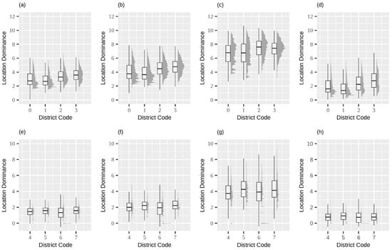 Differences in location dominance between different travel modes. (a,e) Differences between bicycles and walking. (b,f) Differences between electro bicycles and walking. (c,g) Differences between automobiles and walking. (d,h) Differences between public transport and walking. District codes 0–3 refer to Xinhua, Chang’an, Yuhua, and Qiaoxi, respectively; i.e., the central urban area. District codes 4–7 refer to Gaocheng, Luancheng, Luquan, and Zhengding, respectively; i.e., the four suburban areas.