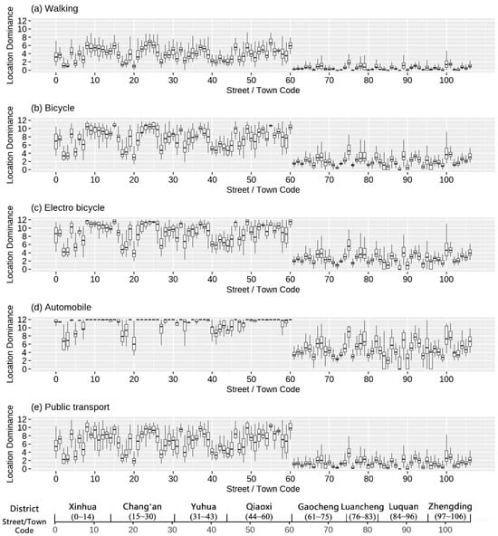 In order to further analyze the distribution of location dominance at the street/town level, boxplots were generated in Figure 5. Location dominance in the central urban area is relatively higher. The number of streets/towns with a location dominance of not less than four (i.e., within a 15 min traffic circle) accounted for 80% of all streets/towns. Furthermore, coverage within the “15 min traffic circle” of public services can reach 12.1% of the metropolitan area. In contrast, location dominance in suburban areas is generally low, but automobile travel can significantly improve it. Specifically, with respect to the automobile travel mode, the number of streets/towns with a location dominance of not less than four accounts for 37% of the total number of streets in the suburban area. With respect to other travel modes, the number of streets with an average location dominance of not less than four (i.e., within a 15 min traffic circle) does not exceed three streets/towns.