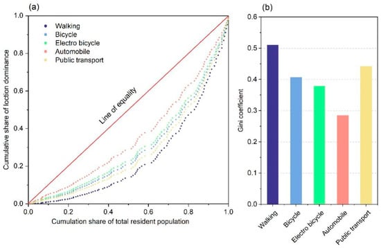 Lorenz curves and Gini coefficients of location dominance based on 107 streets/towns in Shijiazhuang. The diagram (a) shows Lorenz curves for different travel modes. The red line in (a) represents a case of complete equality. The diagram (b) indicates the Gini coefficients for different travel modes.