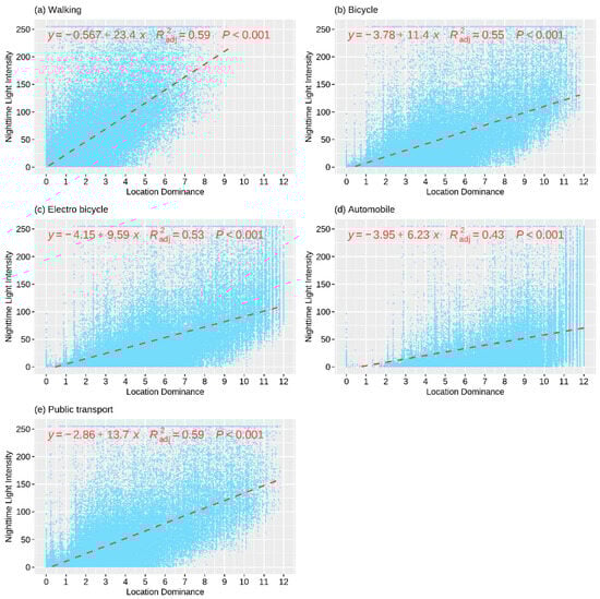 Nighttime light observed from space can serve as a reliable proxy to detect, estimate, and monitor socioeconomic dynamics at a grid scale [,]. A nighttime light grid with 100 m × 100 m resolution was obtained from Luojia1-01 Nighttime Light satellite imagery that had undergone radiation correction, standardized stretching, and resampling analysis. Details of these processes are provided in the Supplementary Materials. At the same time, to ensure that the spatial extent of the location dominance results aligned with the nighttime light data, the results were masked to include only areas where nighttime light data were greater than 0. Figure 7 shows scatterplots of the masked results vs. nighttime light data, with each accompanied by its corresponding unary regression line across the five subplots. The p-value for each subplot was less than 0.001, indicating that the linear correlation between the two variables was extremely significant, i.e., not occurring by chance. The adjusted R-squared was employed to gauge the model’s fit to the observed data, effectively mitigating the overfitting issue by accounting for the number of predictors and the sample size. There was a positive correlation between different travel modes and nighttime light intensity. The strength of the linear relationship between the five travel modes and nighttime lighting decreases in the following order: walking has the strongest relationship, followed by public transport, bicycles, electric vehicles, and automobiles (see red lines in the subplots of Figure 7). Similarly, the steepness of the red line in the subplots indicates that the extent of socioeconomic improvement driven by the degree of location dominance follows the same order.