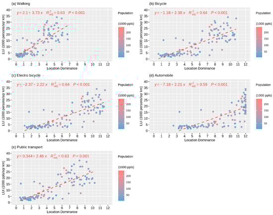 Scatterplots of location dominance vs. land use intensity. Land use intensity, abbreviated as LUI, is plotted on the y-axis, with the unit being 1000 persons per square kilometer. The red dashed lines in the five subplots indicate corresponding unary regression lines. The gradient color of the points in the scatterplots represents the total current resident population (with the unit being 1000 persons).