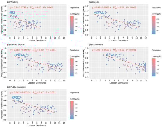 Scatterplots of location dominance vs. the population retention rate. The red dashed lines in the five subplots indicate corresponding unary regression lines. The gradient color of the points in the scatterplots represents the total current resident population (with the unit being 1000 persons).
