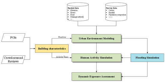 Traditionally, obtaining detailed information about urban geographical features, such as land and buildings, has often relied on surveys. However, the continuous influx of social media and VGI data have paved the way for researchers to garner more intricate urban semantic information [23] and provided new data sources for assessing urban flood simulations [24,25,26,27,28]. The regular updates and extensive data from points of interests (POIs) and social reviews, supported by GIS spatialization technology, offer a novel perspective for geospatial analysis and expression [29]. For example, the category of a POI directly reflects the function of the associated building, while business hours from review websites define the active periods of individuals within these spaces. By effectively integrating and utilizing such data, it is possible to enhance the constraints within agent-based modeling (ABM) simulations, significantly improving the accuracy and reliability of urban flood risk assessments.