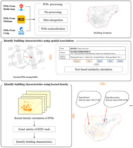 If a POI falls within the buffer zones of multiple buildings, its associated building is determined based on the degree of address similarity. On this basis, the type and activity time of the POIs are assigned to the corresponding building footprints.