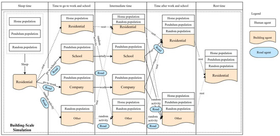 ABM uses a type of computational model that can simulate the actions and interactions of autonomous agents in order to assess their effects on the system [38]. Human movement within a city follows certain patterns, and studies have shown that 93% of human behavior can be predicted [7], indicating a regular system of time utilization in society [39]. In this paper, we develop a multi-agent model of human activities that incorporates interaction rules among agents. Three types of intelligence are defined in this study: human agents, road intelligence, and building intelligence. The human agents are further categorized into home population, pendulum population, and random population based on their behavioral characteristics.