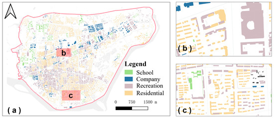Figure 5. (a) Distribution of building functions in the study area, (b) distribution of building functions in block b, (c) distribution of building functions in block c.
