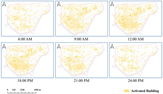 The study area yielded a total of 12,045 POIs from Baidu Maps, 1680 review-based stores from Meituan, and 789 stores from Ctrip. After a comprehensive data cleaning and integration process, the final dataset comprised 11,103 POIs, including 1163 residential-related POIs, 358 school-related POIs, 3797 company-related POIs, and 5785 recreation-related POIs. The spatial distribution of these points is shown in Figure 5. The analysis reveals a notable concentration of residential and commercial areas within the study region. At the block level, commercial and residential buildings are interspersed. Additionally, a temporal analysis of building attributes identifies a clear tidal phenomenon, with urban populations aggregating during specific periods, as depicted in Figure 6.
