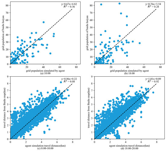 Figure 8. Agent flow verification. (a,b) Scatter plot between grid calculation of agent simulation and Baidu data, (c,d) scatter plot between agent simulated distance and travel distance from Baidu Maps.