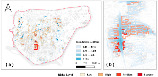Figure 9. (a) Risk distribution of buildings under maximum flood inundation under the 50-year return period, (b) building flood risks.