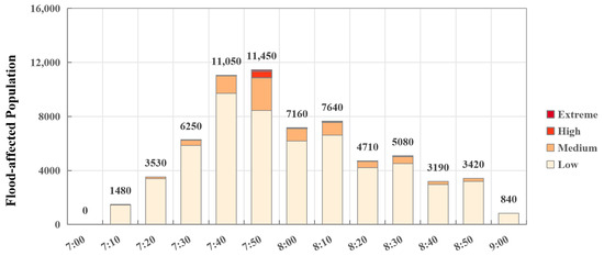 In the context of a 50-year return period rainfall disaster scenario, the temporal and spatial parameters are specified as follows: rainfall was set to begin at 7:00 a.m. and persist for two hours. The rainfall intensity was calculated using the Lishui City formula in conjunction with the Chicago rainfall pattern. The water depth in the study area was simulated. The parameters for this model were derived from prior studies [14,20,30], and the flood simulation results were applied in this paper. Previous research has extensively explored the methods for flood simulation within the study area and provided measured data for validation. We will not elaborate on these details here. The simulation of population activity assumes that 90% of the population follows a pendulum-like movement pattern. The results show that the flooded area reaches its peak after approximately 40 min, as illustrated in Figure 9. A total of 2352 buildings are affected, representing 19.52% of the total number of buildings in the study area. When integrated with the population distribution, the impacts of the disaster at four distinct levels are as follows: the low level affects 1920 individuals, the medium level affects 450 individuals, the high level impacts 80 individuals, and the extreme level affects 10 individuals.