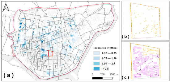 Figure 11. (a) Overlap of block and flooding results, (b) exposed population at block scale, (c) exposed population at building scale.