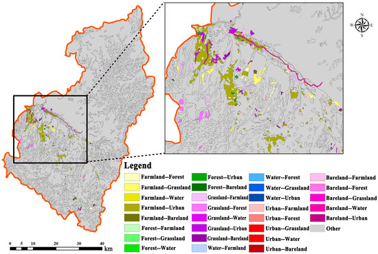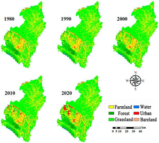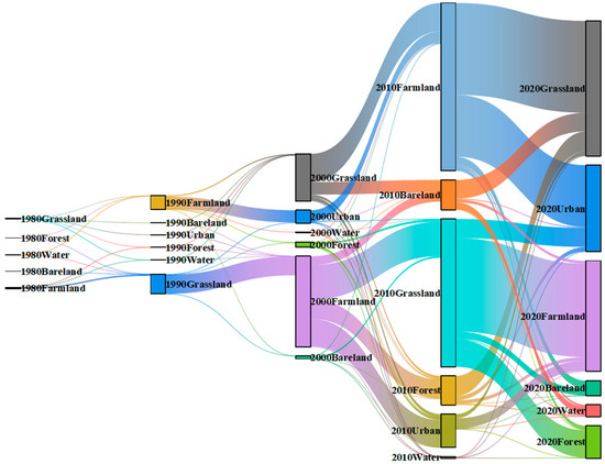 The northeastern part of Yuzhong County exhibits a mixed distribution pattern of farmland and grassland, with significant land use transitions occurring between these two categories. As a result, fine boundary transformation traces are formed within the region. In the southwest, forest land predominates, with the main land conversion occurring between forest land and grassland, leading to boundary scars in forest-grassland land use transitions. To the west, from Heping and Dingyuan towns extending southeastward, land use transitions primarily involve the conversion of farmland and grassland into built-up areas, with clear boundary changes between farmland and grassland. From 1980 to 1990, land use changes were not significant and the conversion area approached zero. Between 1990 and 2000, the largest conversion occurred between farmland and grassland, accounting for more than 90% of the total land use conversion area, with most of the conversions directed toward built-up areas and farmland. Over the next decade, conversion areas for all land types increased, with farmland conversion being the highest, followed by grassland and built-up areas, while all land types saw some degree of conversion inwards. By 2020, land use conversion reached its peak, with farmland and grassland conversions accounting for over 50% of the total conversion area, while the area of forest land, construction land, and bareland significantly increased (Figure 4 and Figure 5).