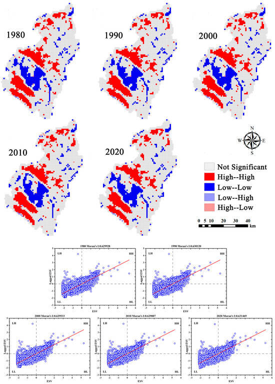 This study applied Moran’s I index to conduct spatial autocorrelation analysis of ecosystem service values within the study area. The results indicate a positive spatial autocorrelation of ecosystem service values, with the distribution of these values exhibiting continuous mutual influence. As a result, areas with higher ecosystem service values tend to have neighboring areas with similarly high values, while areas with lower values are surrounded by regions with comparatively low values. Since the global Moran’s I index only reflects the overall level of ecological value clustering, the study further employed the local Moran’s I index to analyze the degree and characteristics of this clustering. During the study period, the area primarily exhibited two clustering patterns: high-high and low-low. The overall ecosystem service value showed a pattern of increase, followed by a decrease, and then a subsequent increase (Figure 7). As shown in Figure 7, the red line represents the relationship between the linear fitting of the spatial clustering characteristics of the ecological service value and the distribution trend.