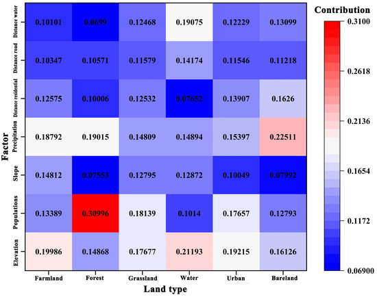 Seven land use driving factors and their interactions with different land cover types were selected for analysis. Using a random forest algorithm, we deeply examined the driving factors that influence land use change and their contribution to land cover conversion. The results indicate the relative contributions of each driving factor to the expansion of various land use types, as shown in Figure 8. The total contributions of the driving factors are ranked as follows: elevation (1.09065) > precipitation (1.05418) > population (1.03114) > distance to water systems (0.73962) > distance to residential areas (0.72932) > distance to roads (0.69435) > slope (0.66073). Elevation was found to have the greatest impact on the conversion of land cover types, driving the evolution of farmland, water, and built-up areas. Precipitation also plays a significant role, particularly affecting barren or moss-covered land in unused areas. The distances to water systems, residential areas, and roads have relatively smaller effects on land cover evolution and their contributions are less pronounced compared to other factors. Slope was identified as the driving factor with the smallest contribution.