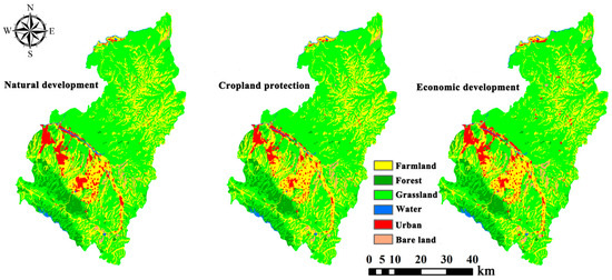 In the natural development scenario, the land use follows natural evolution characteristics without any restrictions on conversion zones and the data transfer probabilities are directly applied. The land use demand predicted by the Markov chain is used as the forecast result without any transfer preferences or restrictions. In the farmland protection scenario, areas that have been arable land in the years 2000, 2010, and 2020 are selected as long-term stable farmland. Additionally, farmland with a slope of less than 6° is considered as high-quality arable land. These two types of farmland are merged to form restricted conversion zones. The Markov transfer probability matrix is adjusted, reducing the probability of farmland being converted to urban by 70%, and decreasing the probability of farmland converting to grassland or water by 40%. The probability of bareland converting to arable land is increased by 50%, ensuring the strict implementation of farmland protection policies. In the economic development scenario, economic growth is the main driver, aiming to promote societal development. A large amount of construction land is required to support spatial development and industrial land construction, which continuously reduces the use of arable land, forest land, grassland, and other types of land. Therefore, in this scenario, the probability of urban converting to arable land, water, forest land, grassland, and bareland is reduced by 40%, while the probability of arable land, forest land, grassland, water, and bareland converting to urban is increased by 40%, 10%, 20%, 10%, and 50%, respectively. The land use forecast maps for different scenarios are shown in Figure 9.