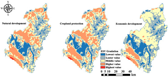 Under the predictions made by the PLUS land use model, land use conditions for three different development scenarios—natural development, farmland protection, and economic development—were forecasted and their corresponding ecosystem service values were calculated. These values were categorized into five levels (highest, higher, middle, lower, and lowest) using the natural breaks method. In the natural development scenario, both land types and the spatial distribution and magnitude of ecosystem service values remained relatively stable. The ecological service value of grasslands was consistently higher, while that of farmland was lower. The highest ecological service value was still located in the forest land of Mapo Township, while the lowest was found in the urban areas of urban centers. In the farmland protection scenario, land area and distribution remained stable, with farmland ecological service values well protected, ensuring food security, which is of significant importance to China’s food security. In the economic development scenario, urban areas within the study area continued to expand, encroaching on adjacent land types. Numerous scattered low-ecological-service-value construction zones appeared in the central and northern parts of the study area, encroaching on previously agricultural and pastoral areas. In the major urban areas, such as Chengguan Town, Dingyuan Town, and Lianda Town, the expansion of urban significantly impacted the ecological service value of the surrounding environment in Figure 10.
