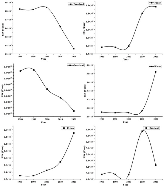 The ESV of grassland began to decline in 1990, indicating that during the expansion of construction land for economic development, grassland resources were prioritized for encroachment before cultivated land was damaged. The decline rate of ESV for grassland reached its fastest from 1990 to 2000. Water bodies are scarce and lack large areas of water, so their ESV remained stable from 1980 to 2010, with all driving factors having little impact. However, by 2020, due to good ecological protection and increased attention to water resources, the flow of inland waters increased and river boundaries widened, resulting in a significant increase in ESV [6,7]. Construction land is also constrained by elevation factors. Due to slow economic development from 1980 to 1990, its ESV remained relatively unchanged. After 1990, with increasing emphasis on economic construction, the area occupied by construction land continuously increased, reaching the maximum growth rate of ESV in 2020. Moreover, due to ecological protection policies and improved quality of economic development, the ESV of construction land has been on a continuous rise [23]. The ESV of unused land generally showed a pattern of stable unchanged followed by an increase and then a decrease. Since unused land is mostly sandy land, Gobi dessert, or bare land, precipitation has the greatest driving effect on it and its ESV changes are directly related to the amount of precipitation [3]. From 1980 to 2000, the amount of ESV remained relatively stable without significant changes. By 2010, due to changes in water resources and precipitation, it showed a significant increase. After 2010, it began to decline from 2010 to 2020.