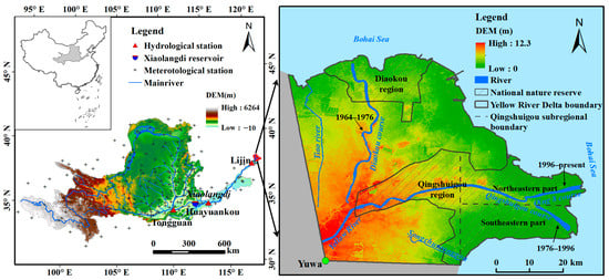 The YRD is located at the mouth of the Yellow River in the northeastern region of Shandong Province, China. Historically, the tail channel of the Yellow River has experienced frequent changes, and the position of the estuary has constantly shifted. According to different time periods, the YRD can be divided into the ancient YRD (before 1855), the recent YRD (1855–1934), and the modern YRD (after 1934) []. The modern YRD takes Yuwa, Dongying city as the apex, extending from the Tiao River in the west part and stretching to the estuary of the Songchunronggou River (Figure 1). Two large artificial diversions have been implemented in the main river channel over the last 50 years. In May 1976, the north-oriented Diaokou course was abandoned and diverted artificially to the southeast-oriented Qingshuigou course. In August 1996, the primary waterway was shifted from the southeast-oriented Qingshuigou course to the northeast-oriented Qing 8 course to facilitate the Xintan and Kendong Oilfields from offshore to onshore operations []. Since then, the main channel has remained relatively stable, except for some minor changes.