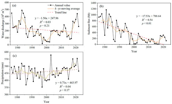 Annual variations in (a) water discharge and (b) sediment flux at the Lijin hydrological station and (c) annual average precipitation in the Yellow River Basin from 1976 to 2022.