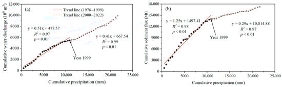 Relationships between (a) the cumulative precipitation and cumulative water discharge and (b) the cumulative precipitation and cumulative sediment flux from 1976 to 2022.