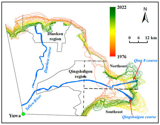 The spatial coastline evolutions in the Diaokou and Qingshuigou regions were remarkably different (Figure 4). Specifically, a landward movement of the coastline in the Diaokou region was observed, and its changing shape displayed three stages: curved outward, gradually flattened, and curved inward. In contrast, a general seaward movement of the coastline was observed in the Qingshuigou region, with the orientation of the coastline extension displaying variability during different periods. From 1976 to 1996, the coastline mainly extended towards the southeast direction. From 1996 to 2022, the coastline started to retreat in the southeast direction and gradually shifted to extend towards the northeast direction.