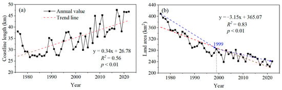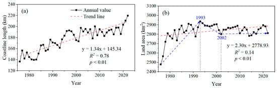 Variations in the (a) coastline length and (b) land area of the Qingshuigou region from 1976 to 2022.
