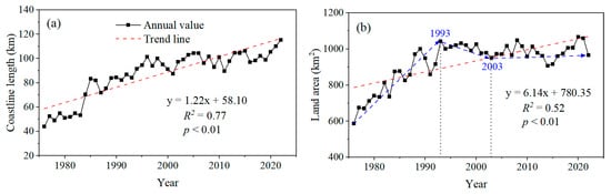 Variations in the (a) coastline length and (b) land area of the Diaokou region from 1976 to 2022.