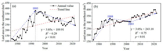 There have been expansions of approximately 121.95 km2 in the southeast and 208.21 km2 in the northeast of the Qingshuigou region (Figure 7). However, the yearly changes in the land area within the southeastern region exhibit notable distinctions compared to those observed in the northeastern region. From 1976 to 1993, the area in the southeastern region showed a steady increase when it reached the peak value of 379.55 km2; then, a rapid decrease occurred from 1993 to 2022 with a decline rate of −3.70 km2 yr−1. In comparison to the annual fluctuations in the area in the southeastern region, the annual area in the northeastern region demonstrated three stages: a rapid growth stage from 1976 to 1988 with an average growth rate of 12.01 km2 yr−1, a retreat stage from 1988 to 2003 with an average decline rate of −0.45 km2 yr−1, and a recovery stage from 2003 to 2022 with an average growth rate of 3.01 km2 yr−1.
