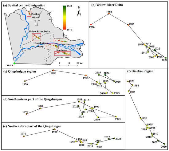 The distribution and migration of the gravity center of land were further examined in the YRD and its subregions. As shown in Figure 9, the land gravity center movement exhibited substantial variations across different regions from 1976 to 2022. The gravity center of land in the whole YRD moved from northwest to southeast overall (Figure 9b). The land centroid in the Qingshuigou region first moved from northwest to southeast and then from south to north (Figure 9c). The migration of the gravity center in the southeast of the Qingshuigou region was remarkably different from that in the northeast. In the southeast of the Qingshuigou, the land gravity center migration exhibited obvious stage characteristics (Figure 9d). It first moved to the northeast from 1976 to 1985, then moved to the southeast from 1985 to 1995, and then moved to the northwest from 1995 to 2022 (Figure 9d). The gravity center of the land in the northeastern region first moved to the northeast from 1976 to 1980, then moved to the southeast from 1980 to 2005, and then moved again to the northeast from 2010 to 2022 (Figure 9e). The land centroid in the Diaokou region mainly moved to the southeast over the study period (Figure 9f).