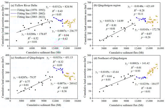 Relationship between cumulative sediment flux and cumulative land accretion area in different regions and periods.