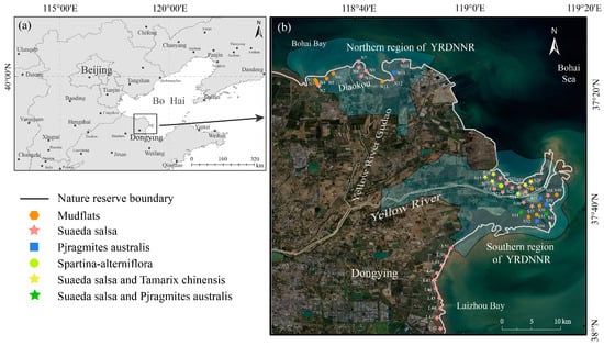 (a) Location of YRDNNR; (b) sampling sites in coastal wetlands of YRDNNR, including two subregions: Northern region of YRDNNR and Southern region of YRDNNR.