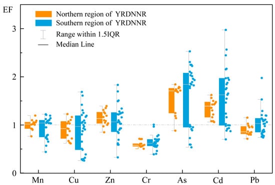 As and Cd were the most toxic metallic elements to living organisms. The co-occurrence of As and Cd in sediments poses a substantial environmental and public health risk, especially through their bioaccumulation in rice and aquatic organisms [68,69]. Human activities, including the application of fertilizer and other agricultural operations, have made a more significant contribution to the increased concentrations of As and Cd in the environment in comparison to natural processes such as weathering [70,71]. All of the EF values for Cr were below 1, indicating no enrichment. Mn, Cu, Zn, and Pb were either not enriched or were only slightly enriched in YRDNNR.