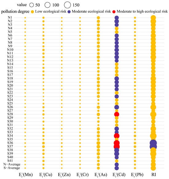 We evaluated the RIs (Figure 4) for the heavy metals in the YRDNNR coastal wetlands to evaluate the impact of toxic heavy metals on the local biota. The of the six metals (Mn, Cu, Zn, Cr, As, and Pb) exhibited minimal variation among the sampling points, with all indicating a low ecological risk ( < 40). In the northern region, the RI range was 57.80 to 103.53, and the potential ecological risk was relatively stable. However, the for Cd presented a moderate ecological risk (40 ≤ < 80), but the overall potential risk was relatively controllable. In contrast, the southern region demonstrated a higher indication of potential pollution, with significant differences in the Cd levels detected at several sampling points. S28 ( = 81.83), S34 ( = 103.5), S36 ( = 119.40), and S37 ( = 127.10) had a moderate to high ecological risk, with the maximum (127.10) increasing by 106% compared to that in the northern region. These sites became the most prominent sources of potential contamination. Furthermore, the comparison of the RIs indicated the potential hazard in the southern region, where the maximum RI reached 193.31, representing an 87% increase over that in the northern region (103.53), suggesting that Cd greatly enhanced the environmental risk. Given its high toxicity value, it can be concluded that Cd was the main factor driving the RI in YRDNNR’s surface sediments. In addition, the significant volatility and severe concentrations of several elements (particularly Cd) in the southern region may indicate the impact of human activities such as fertilizer usage, which should be confirmed in conjunction with studies on their sources.