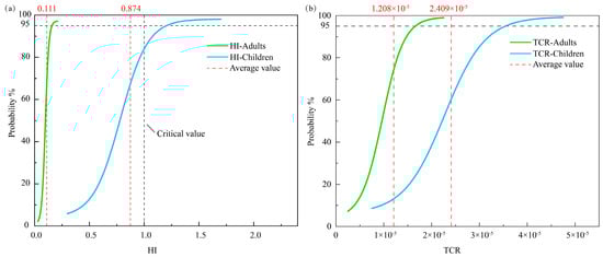 Probability density functions of the (a) HI and (b) TCR of heavy metals in YRDNNR.