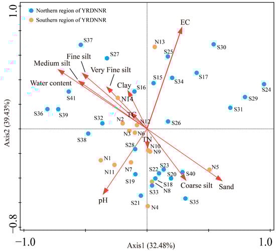 Sampling points were established in YRDNNR coastal wetlands, encompassing the northern region (n = 14) and the southern region (n = 27), during the period from 2 July to 7 2023 (Figure 1), for the purpose of collecting wetland sediment samples. Meanwhile, sampling locations along the coast of Laizhou Bay (n = 10) were established to gather comparative samples for evaluating the protection efficiency of YRDNNR. Sampling was conducted at 2 km intervals as much as humanly possible. For each sample point, five surface samples (0–10 cm) were uniformly blended into one using the five-point sampling method in a 10 m × 10 m quadrant. And we avoided touching plant roots. A total of 51 topsoil samples were obtained. As expeditiously as possible, the samples were transported back to the laboratory in insulated boxes along with ice bags. Once they were brought back to the laboratory, large debris was removed, and the soil samples were then evenly mixed. Part of the samples was stored in a freezer maintained at −20 °C, while the rest was air-dried. Subsequently, the air-dried samples were sieved through 20-mesh sieves (0.850 mm) and 100-mesh sieves (0.150 mm) to determine the soil’s physical and chemical properties, such as water content, electrical conductivity (EC), pH, total carbon (TC), and total nitrogen (TN), as well as heavy metal elements (Fe, Mn, Cu, Zn, Cr, As, Cd, and Pb). The collection, storage, and transportation of the samples were conducted in compliance with the appropriate marine monitoring standards.