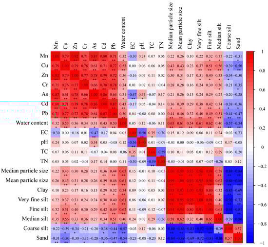 To probe into the intrinsic connections and potential sources of heavy metals in YRDNNR, a Pearson’s correlation analysis was carried out for the seven heavy metals, water content, EC, pH, TC, TN, and sediment particle size (Figure 7). Given that heavy metals tend to be adsorbed by particles smaller than 0.025 mm, silt was classified into very fine silt, fine silt, medium silt, and coarse silt [78]. Generally, there are two primary sources of heavy metals in sediments, natural sources and human-induced activities, which are conveyed to coastal wetlands via rivers. Strong correlations between metals are considered to signify that they stem from similar origins [79]. In YRDNNR, the seven heavy metals exhibited a robust positive correlation (p < 0.01), implying that compound pollution might have been their source. Moreover, the metal elements presented homogeneity and accompanying components [80]. Furthermore, a strong positive association between the seven metals and water content was discovered, indicating that water content was a crucial factor influencing the heavy metal concentrations in YRDNNR.