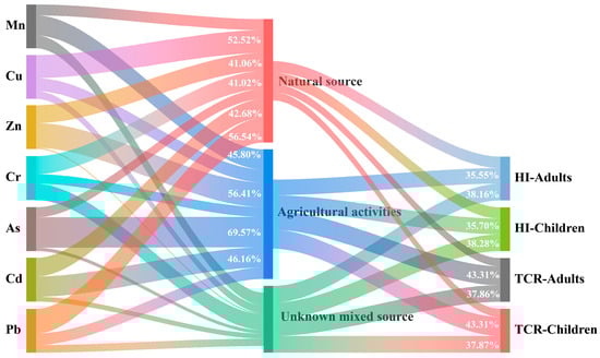 A Sankey diagram depicting the relationships among heavy metals, pollution sources, and health risks. The corresponding contributions of the elements and sources of pollution are indicated by the width of the colored curves.