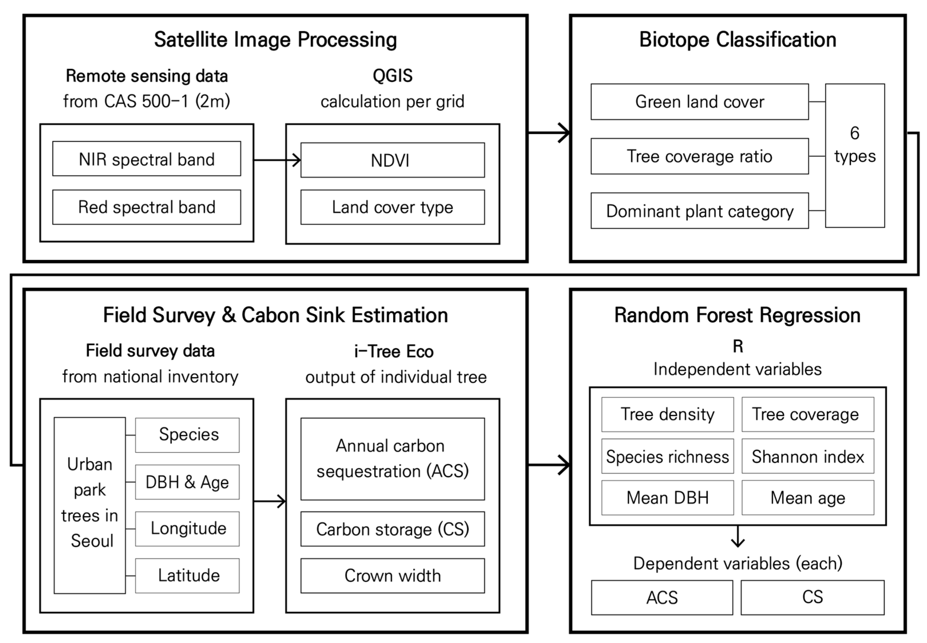 Despite these advances, most carbon-sink studies have focused on forests, wetlands, grasslands, and soils [4,5,6,7], with relatively limited research on UGS [8,9] and the factors influencing their carbon-sink capacity [2,9,10]. In South Korea, spatial studies on UGS carbon sinks remain scarce. Although some regions have implemented UGS tree digitization projects, data inconsistencies persist in coverage, classification, and detail. Given the urban scale, digitization approaches are still in the early stages. With 62.7% of South Korea’s land covered by forests, research has primarily examined forest carbon [11,12] or developed models focusing on individual urban trees [13,14,15]. However, estimating carbon sequestration in UGS is challenging due to high spatial heterogeneity and complex urban interactions, which surpass those in forested areas [9,16]. This complexity highlights the need for further investigation. While UGS covers a smaller area and stores less carbon than forests, it plays a vital role in carbon uptake and ecosystem services in densely populated urban areas.