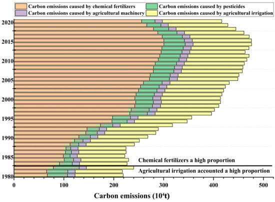 The total cropland carbon emissions in Hebei Province rose from 219 × 104 tons in 1980 to 429 × 104 tons in 2020, representing a 95.9% rise. The average annual compound growth was 1.58% (Figure 3). Overall carbon emissions resulting from fertilizers and agricultural irrigation have risen, with annual average compound growth rates of 3.33% and 0.51%, respectively. Conversely, the carbon emissions stemming from pesticides and agricultural machinery have decreased, with annual average compound growth rates of −1.00% and −0.04%, respectively. The decline in emissions is due to the fuel efficiency of modern machinery, optimized practices like precision farming, and the positive impact of large-scale operations on reducing emissions both in the short and long term [51]. The Hebei Provincial Department of Ecology and Environment reported in its “2020 Work Plan” that the phase-out of 12,000 units of low-emission-standard agricultural machinery resulted in significant emission reductions. From 1980 to 2014, the total carbon emissions from cropland fluctuated upwards, mainly due to the increased use of agricultural inputs like pesticides and fertilizers. From 2014 to 2020, carbon emissions declined, which was attributed to the reduction in land area used for agriculture in Hebei Province, the promotion of ecological environment protection, and the development of eco-friendly agriculture. Prior to 1984, agricultural irrigation contributed the highest proportion of carbon emissions, while after 1984, fertilizers became the main contributor. Overall, carbon emissions from fertilizers initially increased and then decreased, surpassing 50% in 1990 and reaching a maximum proportion of 64% in 2012. In 2020, carbon emissions caused by fertilizers, pesticides, agricultural machinery, and agricultural irrigation accounted for 61.32%, 6.07%, 4.29%, and 29.42% of the total carbon emissions, respectively. It is evident that scientifically controlling the application of fertilizers is crucial for ensuring cropland ecological safety in Hebei Province.
