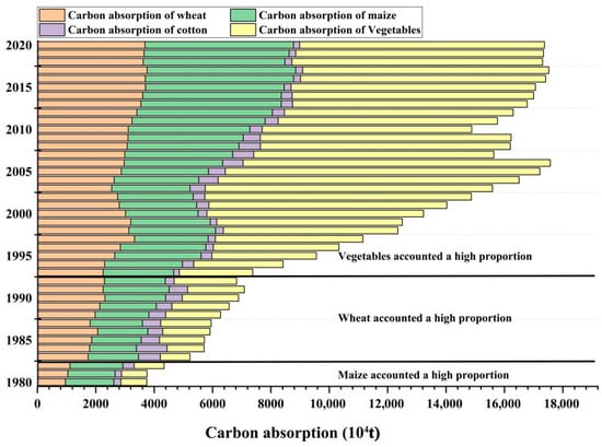 The carbon absorption by various crops in Hebei Province from 1980 to 2020.